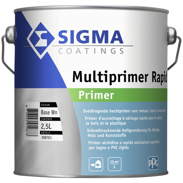 Sigma Multiprimer Rapid is een sneldrogende hechtprimer voor buiten op basis van gemodificeerde alkydhars, geschikt voor hout, staal, verzinkt staal en diverse kunststoffen. Verkrijgbaar in 1 L en 2,5 L.